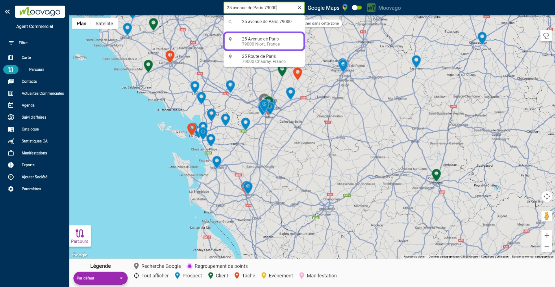 Pour ajouter une adresse postale à un Parcours dans Moovago, il faut passer par la recherche Google intégrée à la carte Moovago.